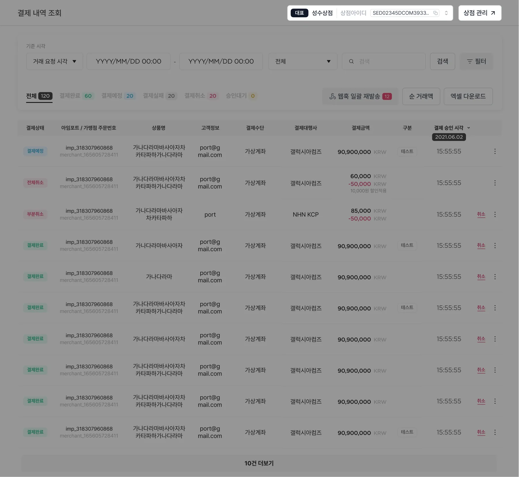 • 전체 또는 하위 상점별로 나누어 통합 결제 내역을 확인할 수 있습니다.